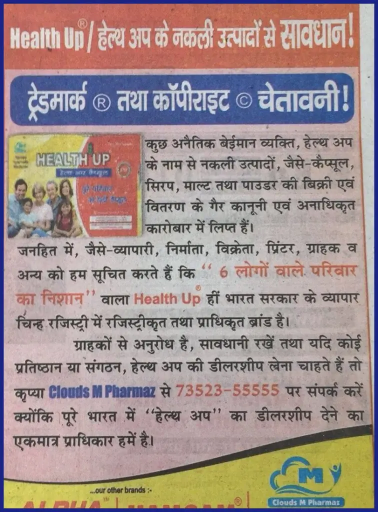 From last couple of years, in Northern and Eastern India, few grey pharma formulation units are trying to reimburse the success & fame of our popular brand Health Up.